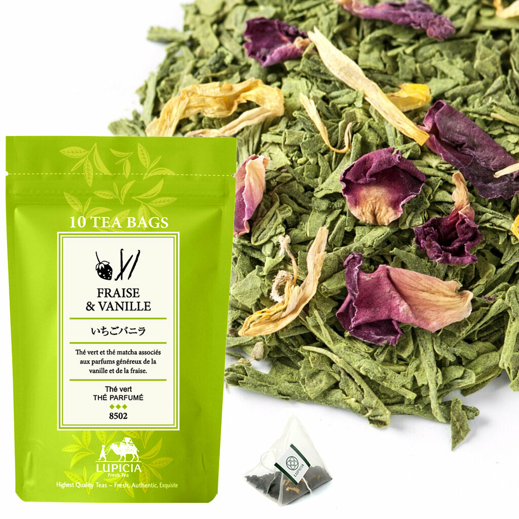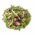 Green tea infused with a strawberry tang and sweet vanilla. This tea is sprinkled with rose and marigold petals. Its green color is produced by the small quantity of Matcha powder contained in this tea. Matcha is a green tea in powder from Japan which brings out color and smoothness to the tea. This tea is delicious straight or with milk.