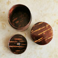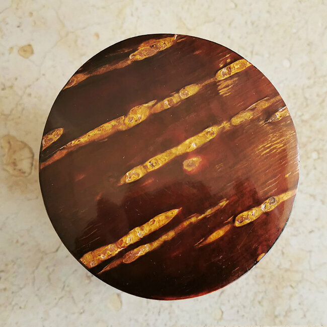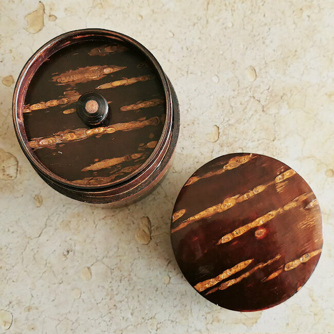 This tea caddie is hand-crafted in Japan. It is made from cherry bark. Kabazaiku cherry-bark craftwork is traditional handcraft that originated in Kakunodate, in the Akita Prefecture, approximately 220 years ago, during the Edo period. Natural cherry bark "breathes" and will enrich in color and grain with handling and age.