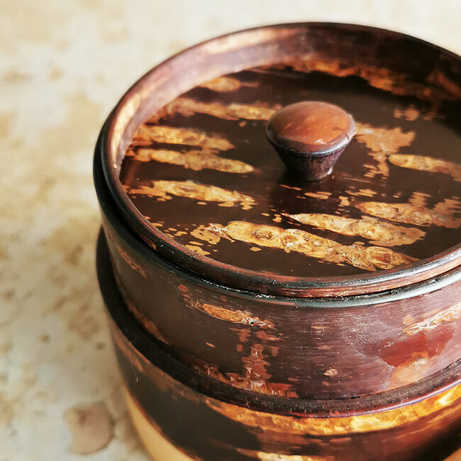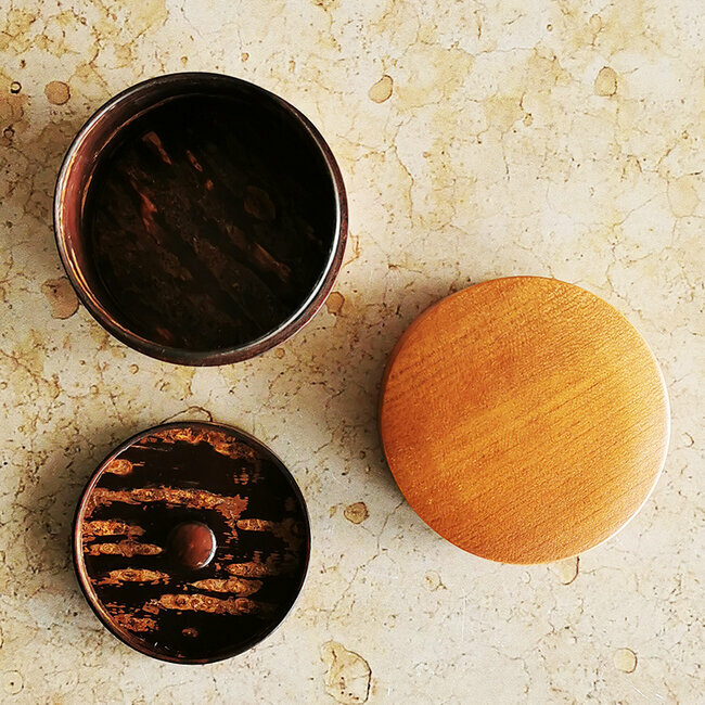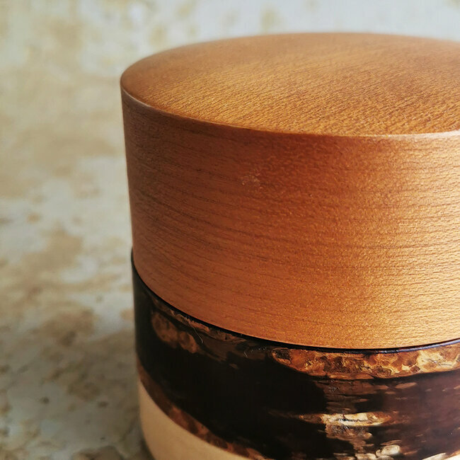 This tea caddie is hand-crafted in Japan. It is made from 3 different types of barks : wild cherry, cherry and maple. Kabazaiku cherry-bark craftwork is traditional handcraft that originated in Kakunodate, in the Akita Prefecture, approximately 220 years ago, during the Edo period. Natural cherry bark "breathes" and will enrich in color and grain with handling and age.